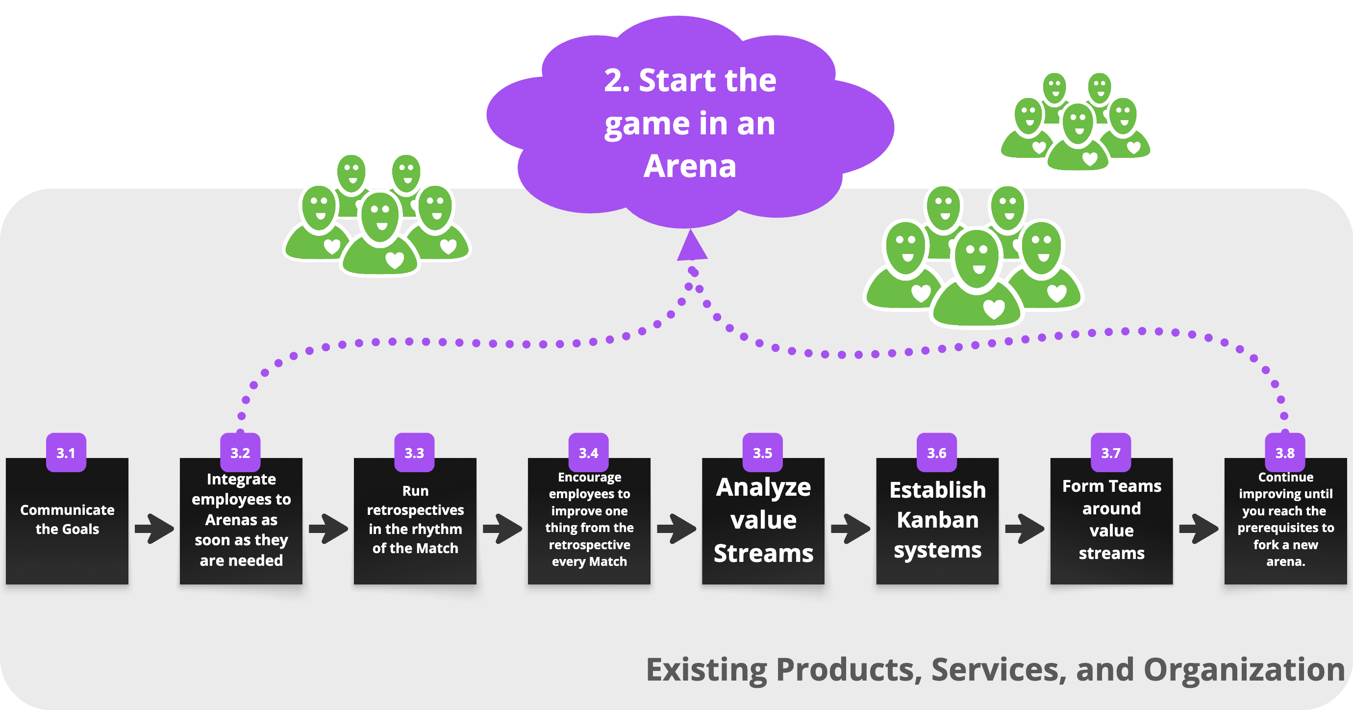 When these conditions are met, transition to Start the Game in an Arena using the entry point that fits the situation. In most cases, this will be Entry Point 2.2, since the teams already work with agile and lean practices. The Arena setup formalizes what has grown organically.