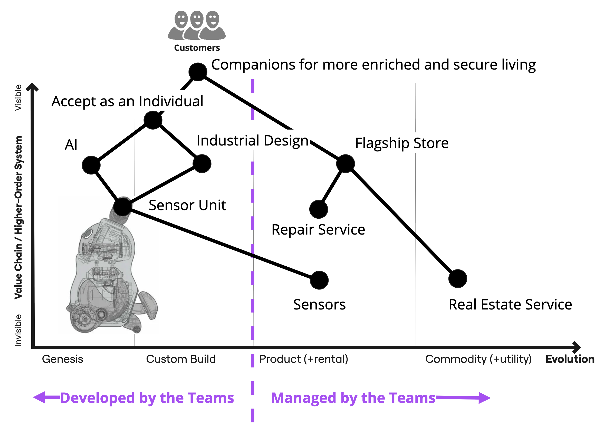 The LOVOT Wardley Map shows the product’s components at different evolutionary stages. On the left (Genesis and Custom Build): the AI behavior, the sensor unit, the industrial design, and the core value proposition, “Accept as an Individual.” These components are still being explored. Their boundaries shift with every iteration. Their Aspects are not yet fully understood.