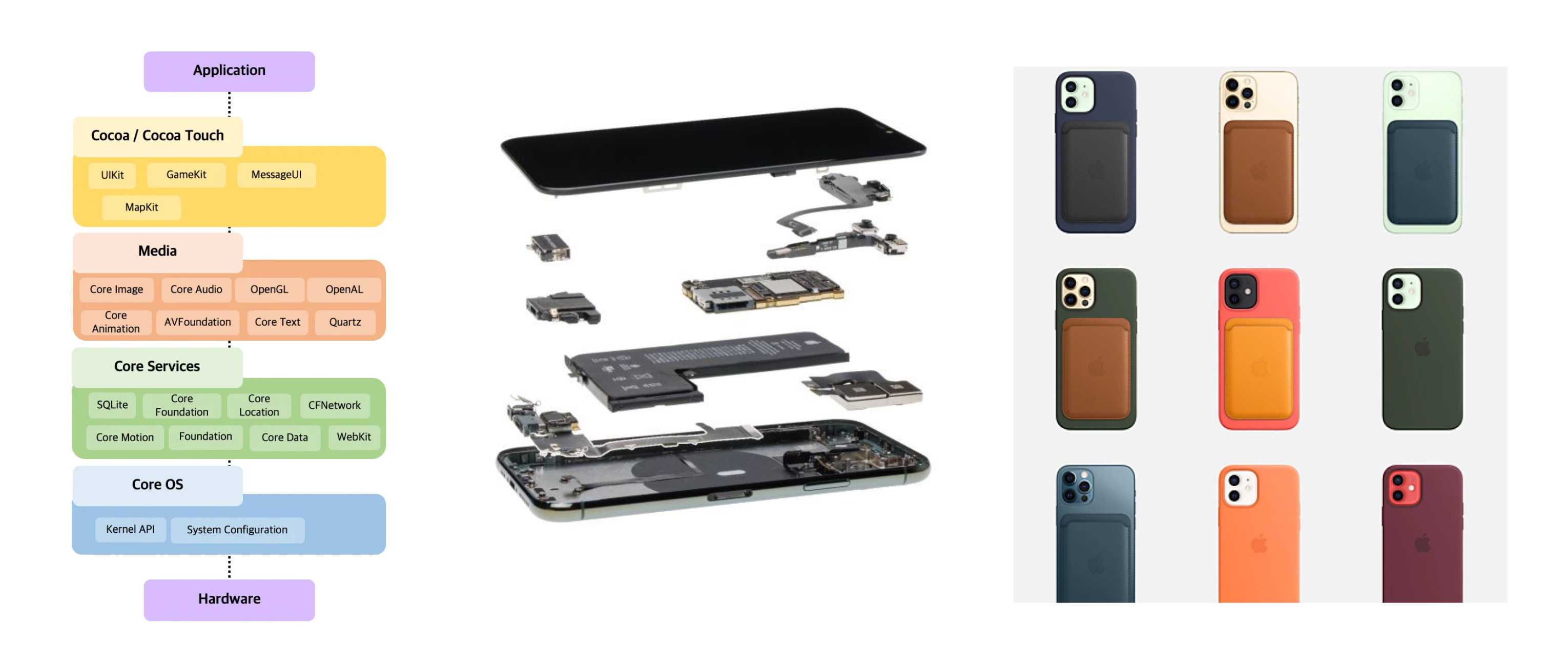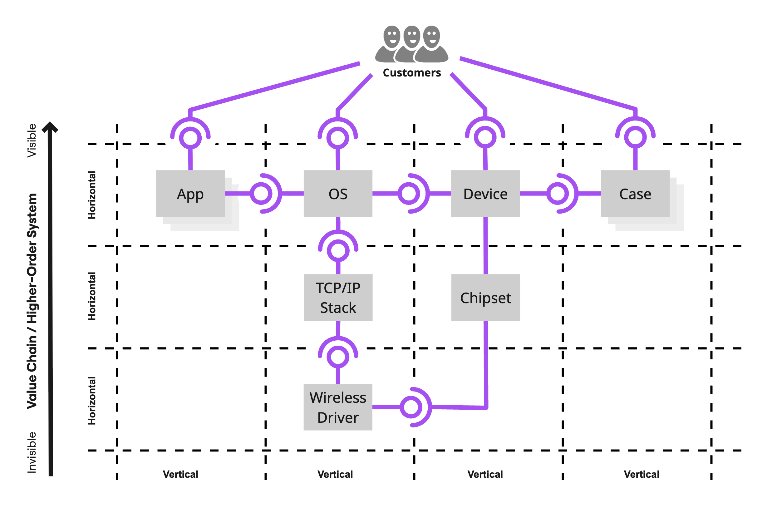 Consider the iPhone. The visible layer includes apps, the operating system, the physical device, and the case. Below that sit invisible layers: the TCP/IP stack, the chipset, the wireless driver. Each component has its own lifecycle, its own rate of change, and its own set of constraints.