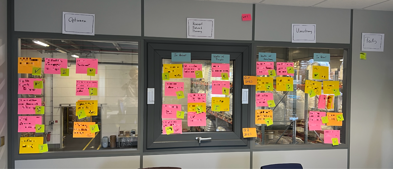 The picture below shows such a Kanban system after an initial workshop. It shows all known projects in the pipeline. Some projects have a volume of more than 10 million € and an estimated project duration of more than 2 years. However, the option column is not yet an Enterprise Backlog. This is because most projects of the Enterprise are missing. It only displays the projects that the potential new Arena will likely be influenced by in the future. Well, at least the workshop participants quickly agreed that the pipeline is already jammed.