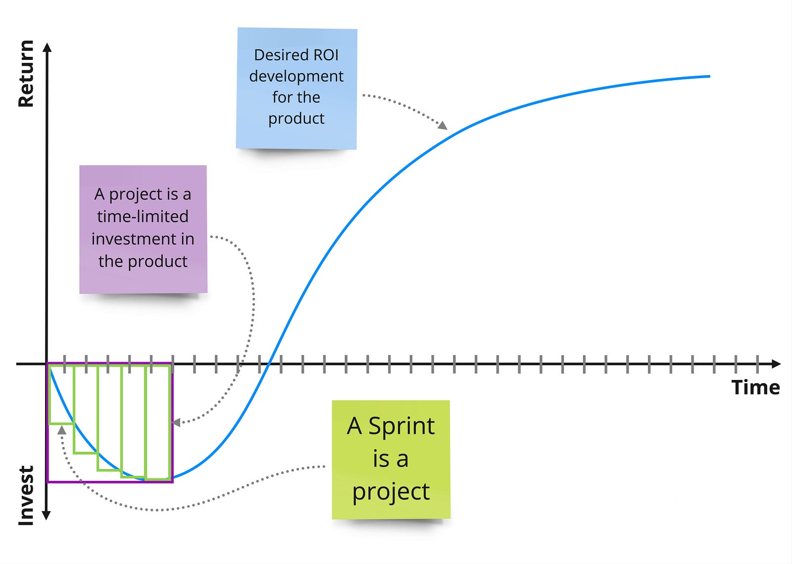The blue curve in the image should be considered as the desired development of the ROI. From a company’s perspective, a project is an investment in the product for a certain period of time (red box in the image). Scrum is a framework that is helping to optimize the value generated for this investment. Scrum can be understood as a sequence of projects with a fixed period of one sprint (green boxes in the image). Scrum thus generates knowledge about how the next investment in the product can be improved at often much shorter intervals as before. In extreme cases, this knowledge can stop the investment in the product completely at an early stage. So, how should you handle a new project if you want to think in terms of product development right from the start?