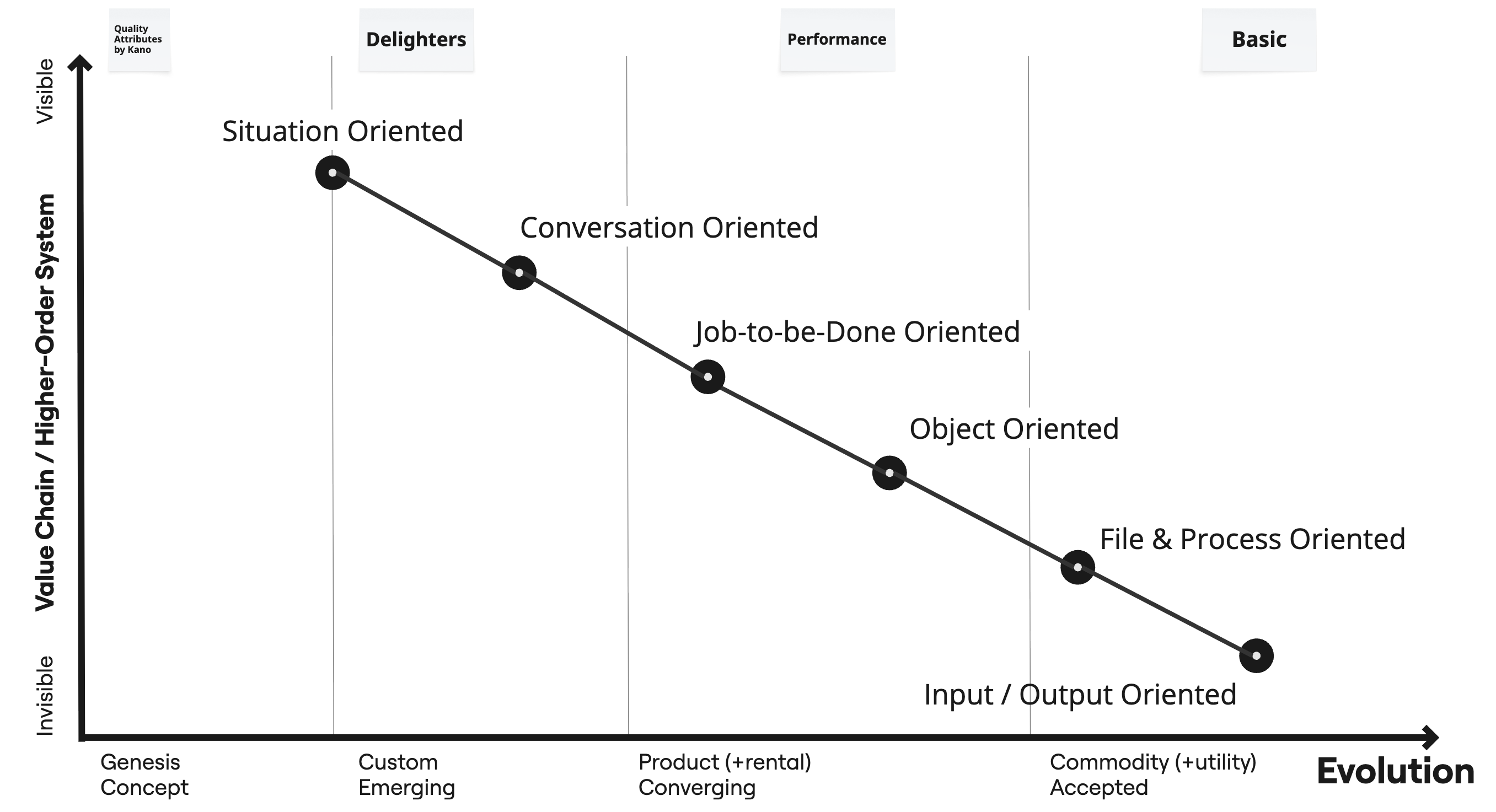 Two columns deserve special attention. The Kano Model captures how users perceive each paradigm. What once excited customers eventually becomes expected. File management was a revelation in the 1980s. Today nobody is impressed by “File > Save As.” Conversational AI still delights in 2026, but in a few years users will simply expect it. Early paradigms have become Basic quality: taken for granted, noticed only when missing. Middle stages still offer Performance quality: the more, the better. The latest stages deliver Delighter quality: unexpected, differentiating, hard to compete against. A product stuck at Basic competes on price. One that delivers the next Delighter leads the market.